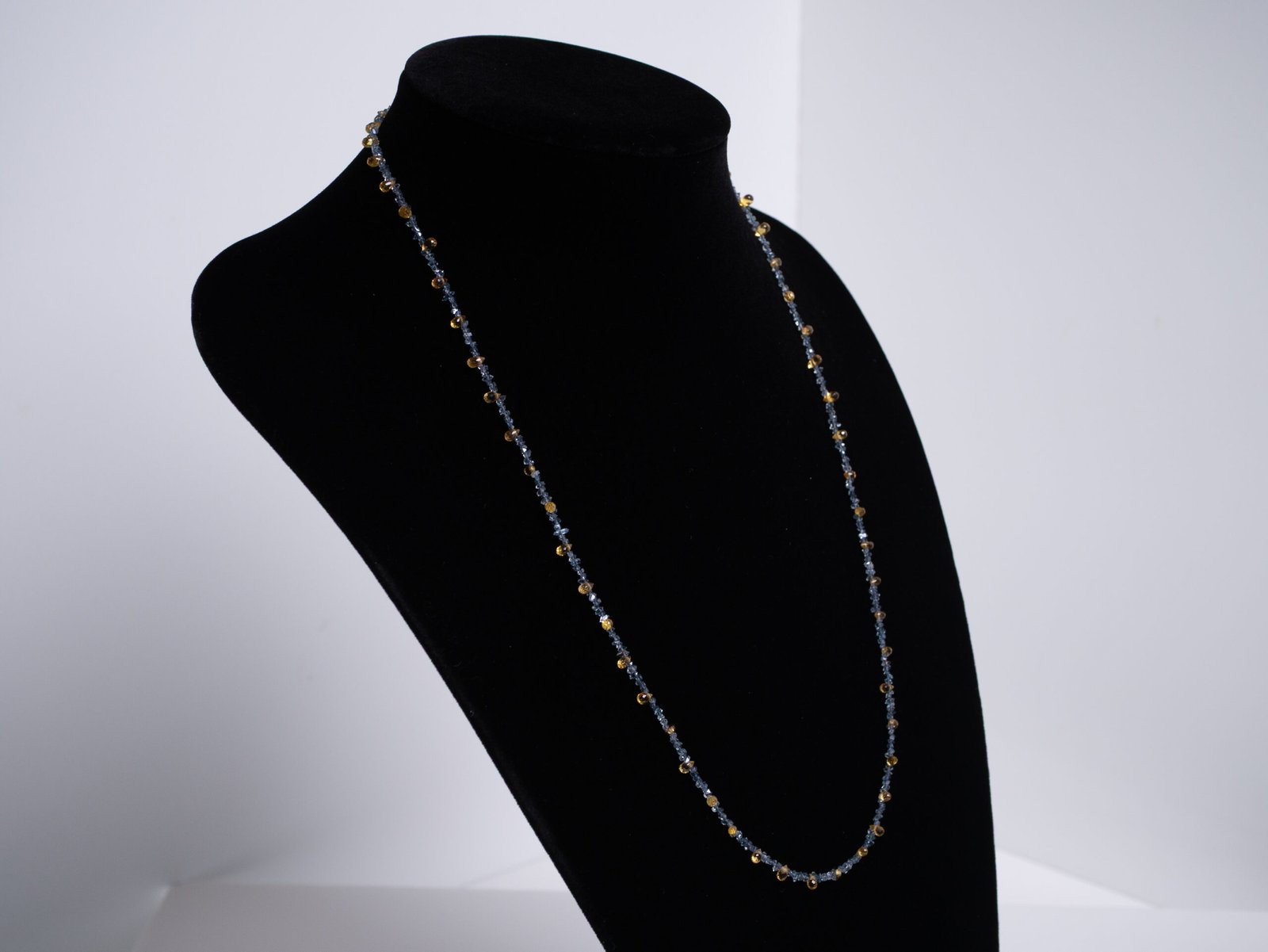 Designed by Linda Loudermilk, the Blue Dawn Necklace captures the quiet moment when night softens into morning. A strand of icy blue Herkimer diamonds—raw, shimmering, perfectly imperfect—sets the foundation. Woven throughout, petite yellow sapphire briolettes spark like first light breaking across a horizon. The interplay of cool crystal and warm fire creates a tension that feels alive on the skin.