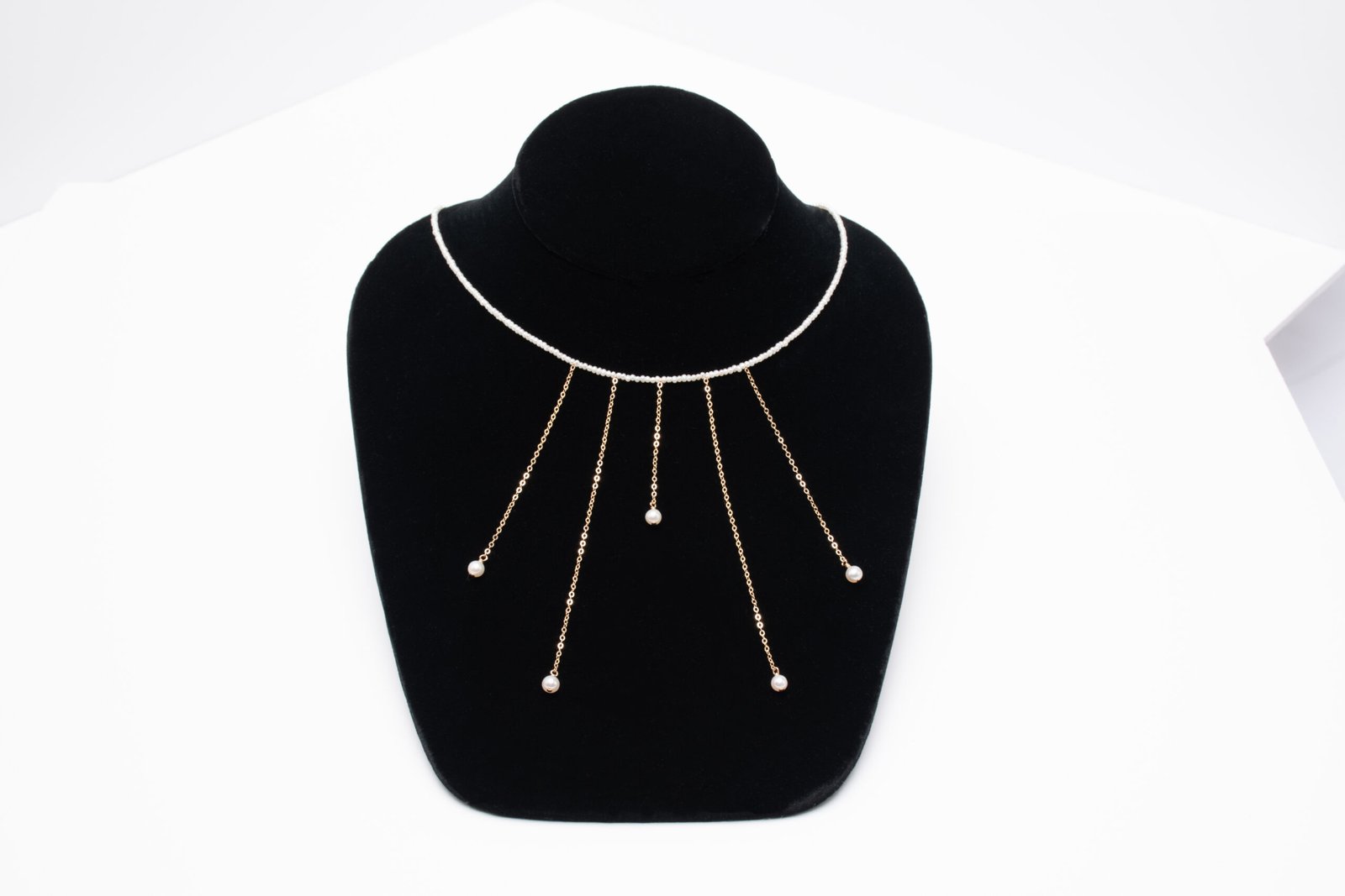 lightly at the collarbone, while five luminous pearl drops descend from gold.
